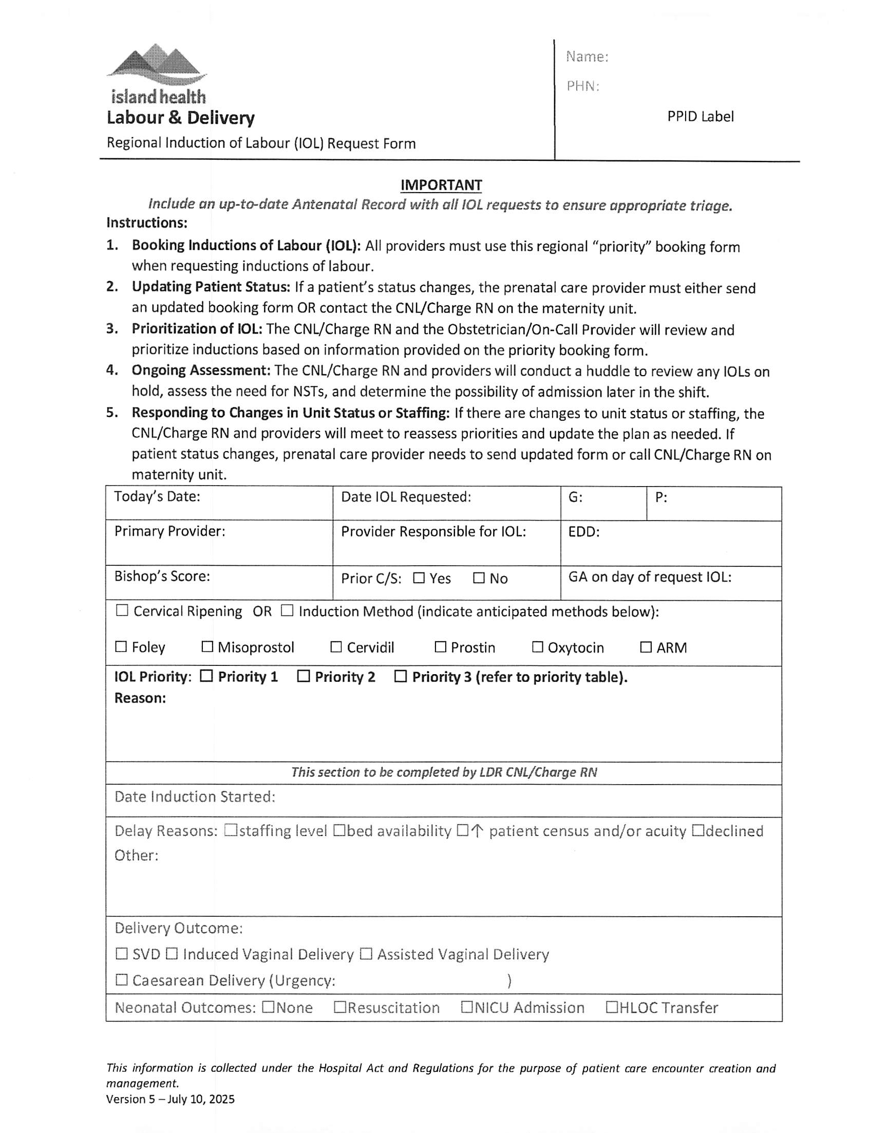VIHA - Induction Labour Booking Form Print