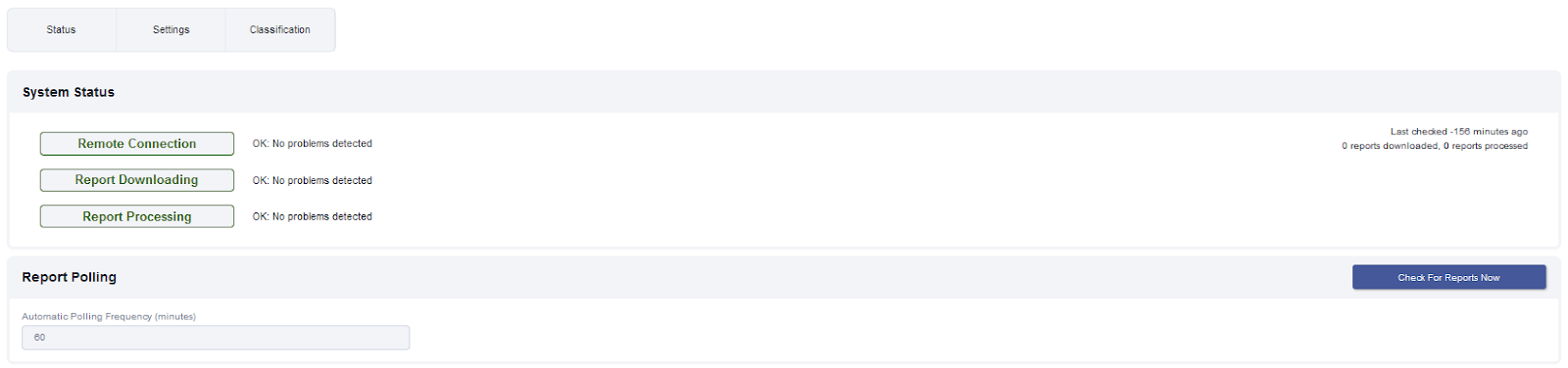 Below those status indicators you will find a Check For Reports button. If you are waiting for a report and believe that it should have arrived, you can click this button to manually request all HRM reports that have been assigned to your system. Those HRM reports will appear in your Inbox.