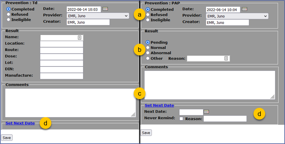 - For examinations: Record the status of the test (pending, normal, abnormal or other). Select ‘Pending’ if you are sending a PAP sample to the lab, for example, then come back to update the result at a later date (see section on editing existing preventions).